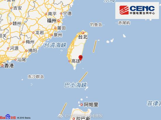 台湾气象部门地震测报中心观测,各地最大震度台东5级,屏东、台南、高雄各为1级。