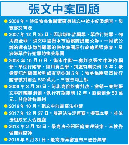2013年2月刑滿釋放后,張文中向河北省高級法院提出申訴被駁回。最高法於2017年12月27日作出再審決定。