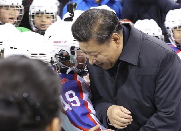 在北京五棵松体育中心,习近平拉着一位小冰球队员的手,俯下身,与他肩碰肩,做了一个“对抗”的姿势,笑着说,小伙子块头要再长大一点。
