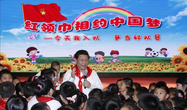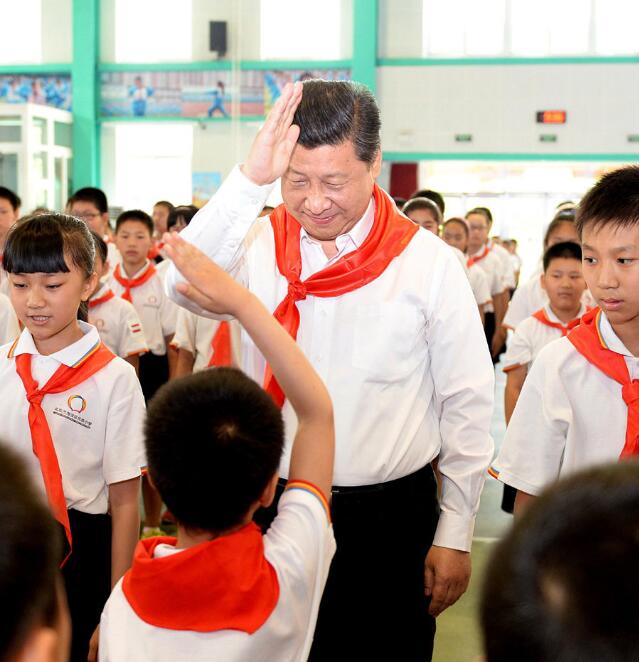 习近平参加少先队入队仪式。鲜艳的红领巾,庄严的队礼。