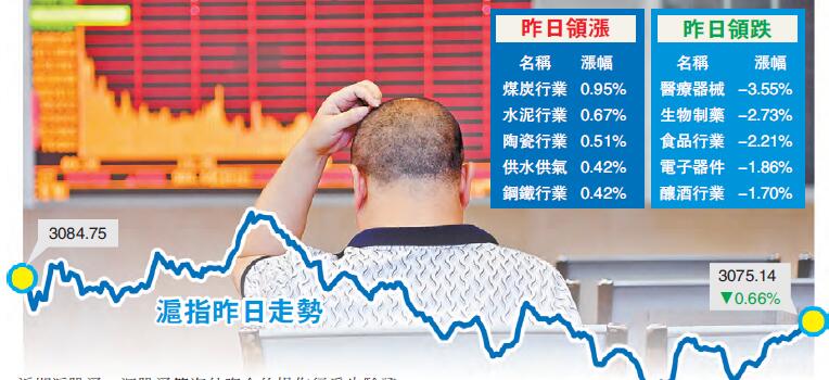 當日上證綜指以3084.75點小幅低開,總體呈現冲高回落態勢。盤中滬指短暫翻紅并冲上3100點整數位,摸高3102.09點后掉頭向下。下探3059.79點的全天低點后,滬指收報3075.14點,較前一交易日跌20.33點,跌幅為0.66%。