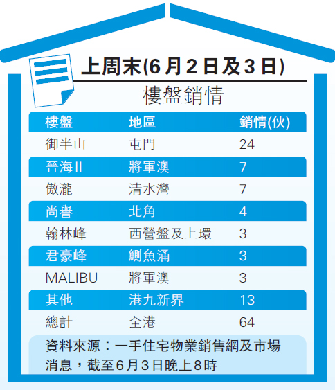 6月起港九新界均有大型新盤應市,搶盡市場焦點,令二手市場交投表現淡靜,成交量減少。綜合四大代理數據,於剛過去的周末十大指標屋苑買賣當中,按地區劃分,新界區成交量領冠,「沙田第一城」成最受歡迎樓盤,共錄得13宗;九龍區「美孚新」錄得3宗成交;港島區「康怡花園」則錄得3宗成交。