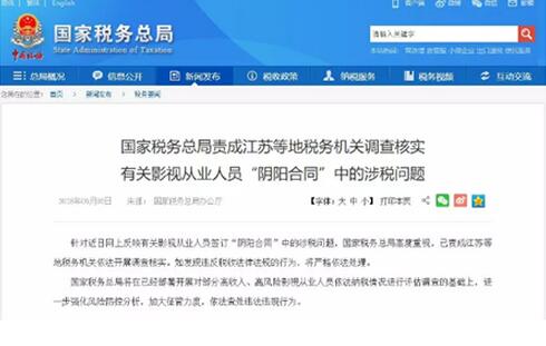 知名主持人崔永元曝光某演员签一大(5000万)一小(1000万)双合同后,社会聚焦部分明星借大小合同(即“阴阳合同”)偷税。对此国家税务总局称,针对近日网上反映有关影视从业人员签订“阴阳合同”中的涉税问题,国家税务总局高度重视,已责成江苏等地税务机关依法开展调查核实。如发现违反税收法律法规的行为,将严格依法处理。