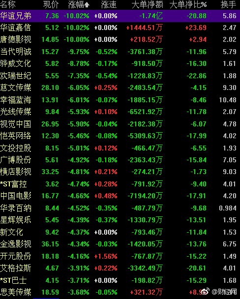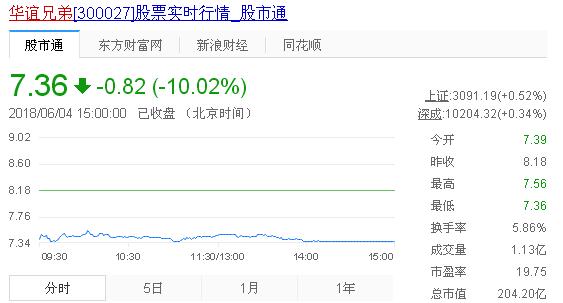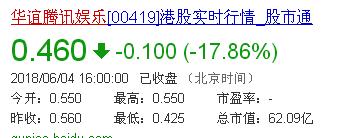 受税务稽查部门严查明星“阴阳合同”消息影响,6月4日股市影视板块遭重挫,一片绿油油……华谊兄弟、华谊嘉信、唐德影视跌停。而在香港上市的华谊腾讯娱乐 (00419) ,更是重挫17.86%,收报0.46港元。截至收盘,沪指涨0.52%,报收3091.19点;深成指涨0.34%,报收10204.32点;创业板跌0.39%,报收1702.93点。
