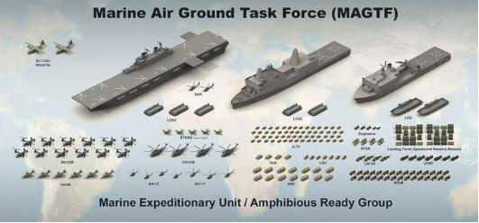 “我们未来可能需要两个以上海军陆战队的空地合成作战特遣部队(MAGTF 海军陆战队基本编组单位,美国海军陆战队群MEU,远征旅MEB,和远征军MEF都会被叫做空陆合成特遣部队,观察者网注)出现在同一地区,因为海军陆战队要前沿部署在敌方区域,如果潜在的敌人决定要开战,那么海军陆战队必须执行接触与钝化任务(contact and blunt layer,就是迟滞敌军兵力行动),海军陆战队将联手美国海军水面舰艇部队和潜艇部队,还有空军以及电子战单位,首先削弱他们的实力。”海军陆战队主管计划,政策和行动的中将布莱恩·博德罗本周一在海军学院和国际战略研究中心的共同会议上说道。