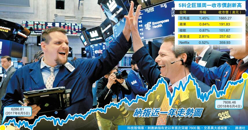 納指周一上升0.7%至7606.46點,突破3月12日高位7588.32點。個股中,蘋果、微軟、英偉達和Netflix股價集體創下收盤新高,亞馬遜則連續6個交易日創收市紀錄新高。同在紐約股票市場,標普500指數和道指當天同樣上漲,但尚未刷新今年1月創下的高位。納指今年迄今累計上升10%,標普500上升2.7%,道指上升0.4%。