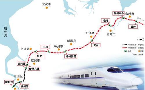 新建的杭绍台铁路起于绍兴北站,沿途经过嵊州、新昌、天台、临海后到达台州中心站,然后继续南下,终到温岭,新建正线全长226.556公里。