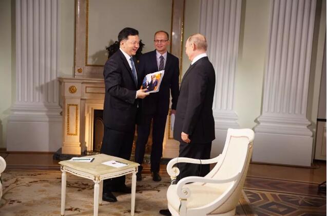 △在采访前,慎海雄向普京总统展示了中央广播电视总台旗下新媒体平台推出的网络互动活动“谁是普京粉”和“我想问普京”的画册。画册封面印有习近平主席与普京总统的合影。