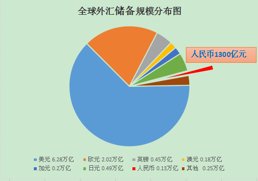 首先,人民币在全球外汇储备中的占比只有不到1.3%,而美元占比高达近63%,差距可谓天壤之别。据国际货币基金组织最新资料显示,截至2017年第4季度,全球外汇储备中的美元规模升至6.28万亿美元,其中美元在已分配外汇储备中占比达到62.7%, 而人民币外汇储备规模在整体已分配外汇储备中占比只有1.23%。