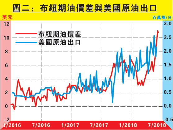 然而國際海事組織將在2020年實施新排放規定,貨船燃料油的硫含量上限為0.5%(目前為3.5%),相信原油需求將大幅上升,為布紐油價帶來推動力。雖然美國原油質素比布蘭特原油好,但是美國原油主要供給美國消費,布蘭特原油則出口到國際市場,估計其需求上升更為明顯。另一方面,美國頁岩油產量上升而輸往墨西哥灣的輸油管不足,使大量存貨堆積於德州及奧克拉荷馬州,估計紐油價格乏力反彈。反而英國北海原油生產運作相對穩定下,料布紐期油價差將繼續擴闊。綜合圖二結果,推測美國原油出口量將繼續上升。