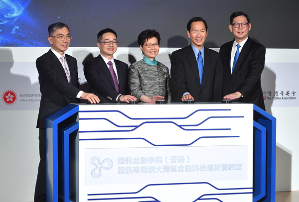 粵港澳大灣區金融科技論壇昨在香港科學園舉行(左起:財經事務及庫務局局長劉怡翔、騰訊集團副總裁及騰訊金融學院院長賴智明、特首林鄭月娥、行政會議非官守議員召集人陳智思和金融管理局總裁陳德霖)。中新社