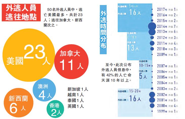 分析稱,此次發布的50名涉嫌職務犯罪和經濟犯罪的外逃人員,逃往美國的最多共計23人,11人逃往加拿大,6人逃往新西蘭,4人逃往澳大利亞,2人逃往香港,逃往新加坡、英國、泰國和越南的各1人。其中,貪污、受賄、挪用公款在外逃人員涉嫌犯罪類型中所佔比例較重,其他涉嫌犯罪類型還有職務侵佔、騙取貸款等。