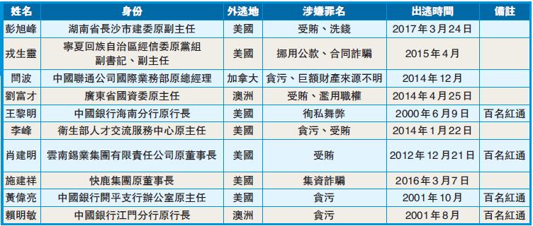 值得關注的是,相比去年公布的外逃人員藏匿線索,本次公告在數量、信息上再次升級,不少人級別高、影響大,例如,2017年3月24日外逃的湖南省長沙市建委原副主任彭旭峰,2015年4月外逃的寧夏回族自治區經信委原黨組副書記、副主任戎生靈,2014年12月外逃的中國聯通公司國際業務部原總經理閆波,2014年4月25日外逃的廣東省國資委原主任劉富才等,原先均為局級領導幹部,且出逃時間均較短,在防逃「篱笆」越扎越緊的形勢下頂風作案,性質和影響較為惡劣,引起中央追逃辦的高度重視。