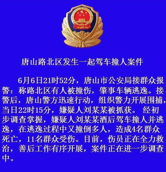 通报称,6月6日21时52分,唐山市公安局接群众报警:称路北区有人被撞伤,肇事车辆逃逸。接警后,唐山警方迅速行动,组织警力开展围捕,当日22时15分,嫌疑人刘某某被抓获。经初步调查掌握,嫌疑人刘某某酒后驾车撞人并逃逸,在逃逸过程中又撞倒多人,造成4名群众死亡,11名群众受伤。