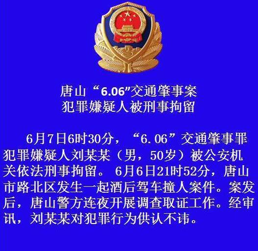 7日上午,唐山交警再次通报称,7日上午6时30分,涉案嫌疑人刘某某(男,50岁)被公安机关依法刑事拘留。经审讯,刘某某对犯罪行为供认不讳。