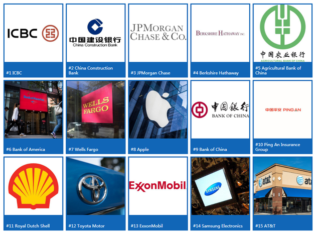 “全球上市公司2000强”根据营收、利润、资产和市值的均等加权指标排序。中国工商银行和中国建设银行连续6年排名第1和第2位。紧随其后的是第3名的摩根大通和第4名的伯克希尔-哈撒韦。其他入围前10的公司依次为中国农业银行、美国银行、富国银行、苹果公司、中国银行和平安保险集团。