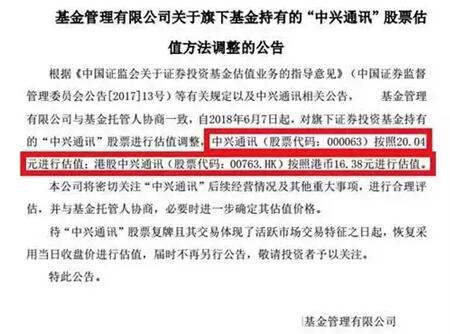 6月7日晚间,上海一家基金发布公告称,自6月7日起,对旗下证券投资基金持有的“中兴通讯”股票进行估值调整,对A股中兴通讯按照20.04元进行估值;港股中兴通讯(00763.HK)按照港币16.38元进行估值。