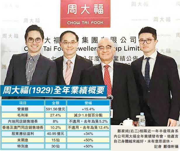 至於周大福的業績,截至今年3月底止,全年純利按年增長34%至40.95億元,末期息每股15仙,另派特別息每股30仙。期內,內地和港澳的同店銷售由負轉正,其中內地同店銷售由減少5.2%轉為增長8%;香港及澳門同店銷售由減少12.4%轉為增長10.2%。