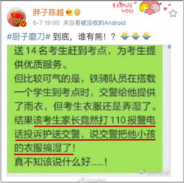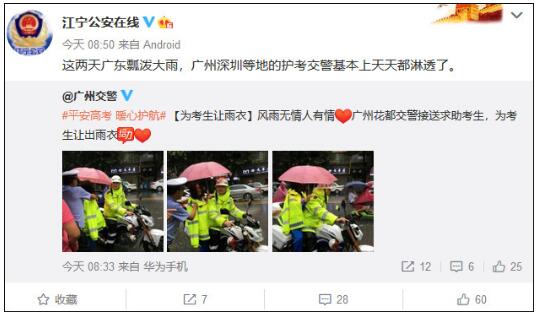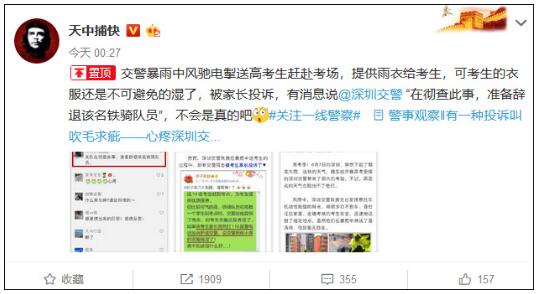 8日凌晨,微博网友@天中捕快发布一条消息称,“交警暴雨中风驰电掣送高考生赶赴考场,提供雨衣给考生,可考生的衣服还是不可避免的湿了,被家长投诉,有消息说@深圳交警 ‘在彻查此事,准备辞退该名铁骑队员’,不会是真的吧。”