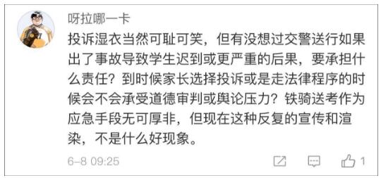 文章称,风雨中,深圳交警铁骑充分发挥摩托车机动性能强的特点,将很多打不到车、身份证拉家里、走错考场的考生安全、迅速地送到了指定地点。虽然他们在暴雨中淋成了落汤鸡,但却毫无怨言。然而,深圳交警铁骑在暴雨中送考生的过程中,却有交警同志被考生家长投诉了。