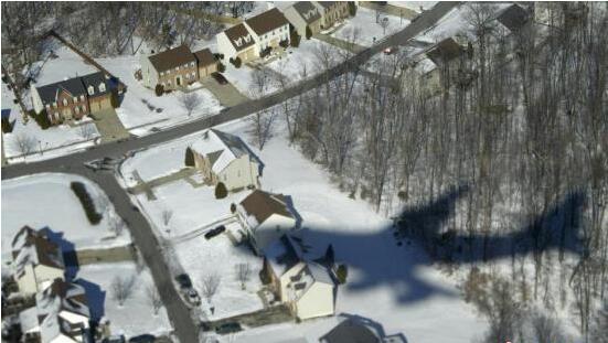 图为2004年1月31日,“空军一号”在马里兰州被白雪覆盖的华尔道夫酒店上空。