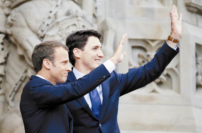 法國總統馬克龍(左)在加拿大首都渥太華會晤加方總理、東道主杜魯多。 路透社
