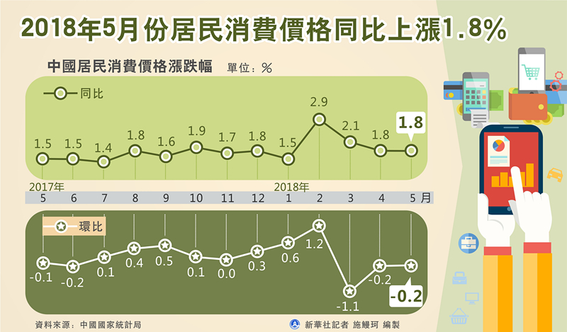 【香港商報网訊】統計局昨日發布的2018年5月份全國居民消費價格指數(CPI)和工業生產者出廠價格指數(PPI)數據顯示,CPI環比下降0.2%,同比上漲1.8%;PPI環比上漲0.4%,同比上漲4.1%。國家統計局城市司高級統計師繩國慶表示,食品價格下降是CPI環比下降的主要因素。