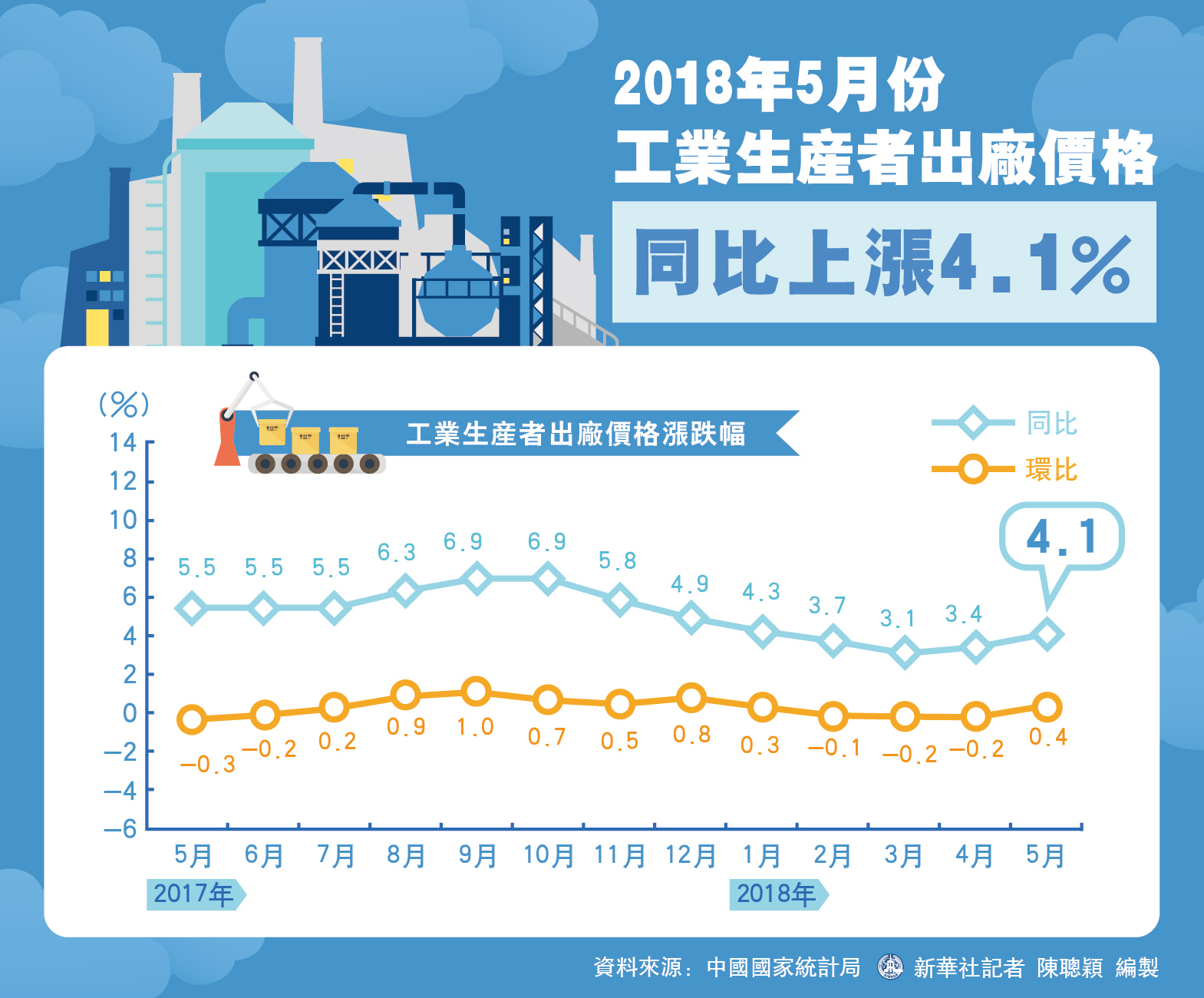 從同比看,PPI漲幅比上月擴大0.7個百分點。生產資料價格上漲5.4%,漲幅比上月擴大0.9個百分點;生活資料價格上漲0.3%,擴大0.2個百分點。在主要行業中,漲幅擴大的有石油和天然氣開採業、石油煤炭及其他燃料加工業、黑色金屬冶煉和壓延加工業、化學原料和化學製品製造業、有色金屬冶煉和壓延加工業,合計影響PPI漲幅擴大約0.67個百分點。漲幅回落的有非金屬礦物製品業,上漲10.6%,比上月回落0.4個百分點;煤炭開採和洗選業,上漲3.8%,回落0.6個百分點。據測算,在5月份4.1%的同比漲幅中,去年價格變動的翹尾影響約為3.9個百分點,新漲價影響約為0.2個百分點。