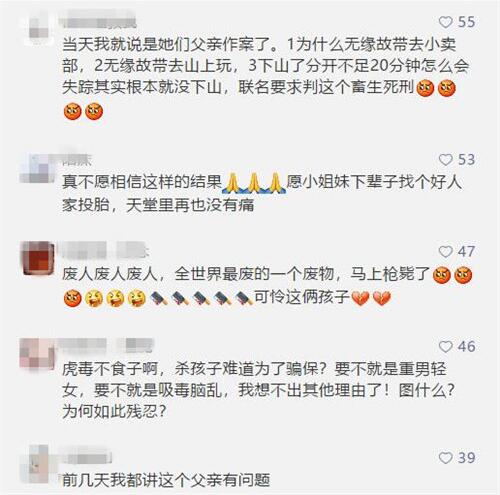 嫌犯为被害人父亲的事实让网友们很愤怒。看到警方将两姐妹的尸体从山上抬下来,不少围观村民都禁不住哭了,并痛斥其父亲的残忍。