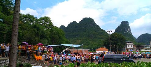 今天下午1点多,记者再次来到两姐妹家所在的柳江区里高镇,天空随后飘起了点点雨滴。在里高东街球场,上千名群众闻讯赶来,大家议论纷纷、情绪激愤。当地公安民警在路口设置了警戒线,封锁了上山通道,还有部分民警则正在一处有建筑物的山顶调查。