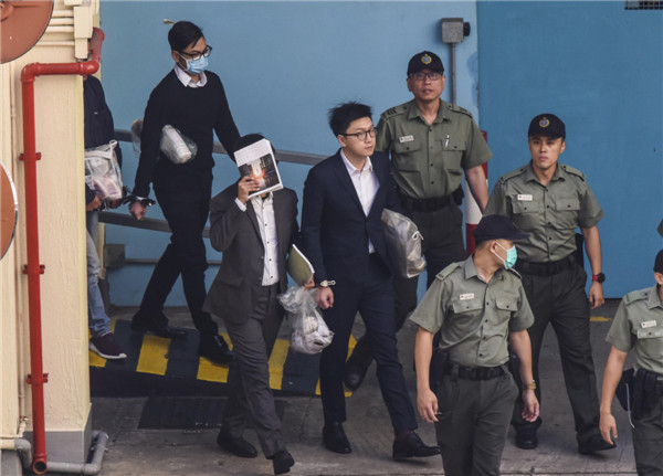 梁天琦(左三)、卢建民(左二)及黄家驹(左一)由囚车押送至高等法院应讯。