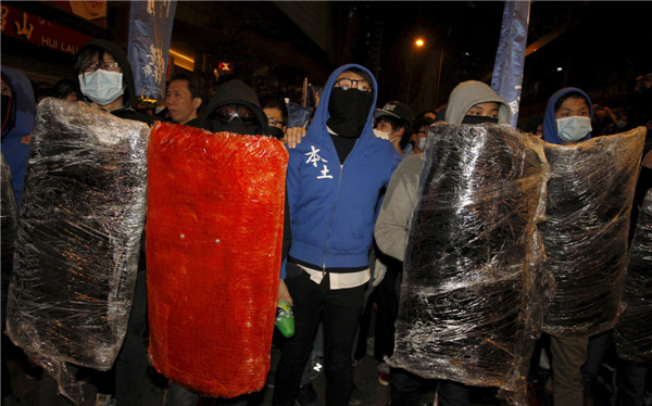 2016年2月9日暴乱发生前,疑是梁天琦(蓝衣)的男子,与多名持自制盾牌人士站在旺角街头。