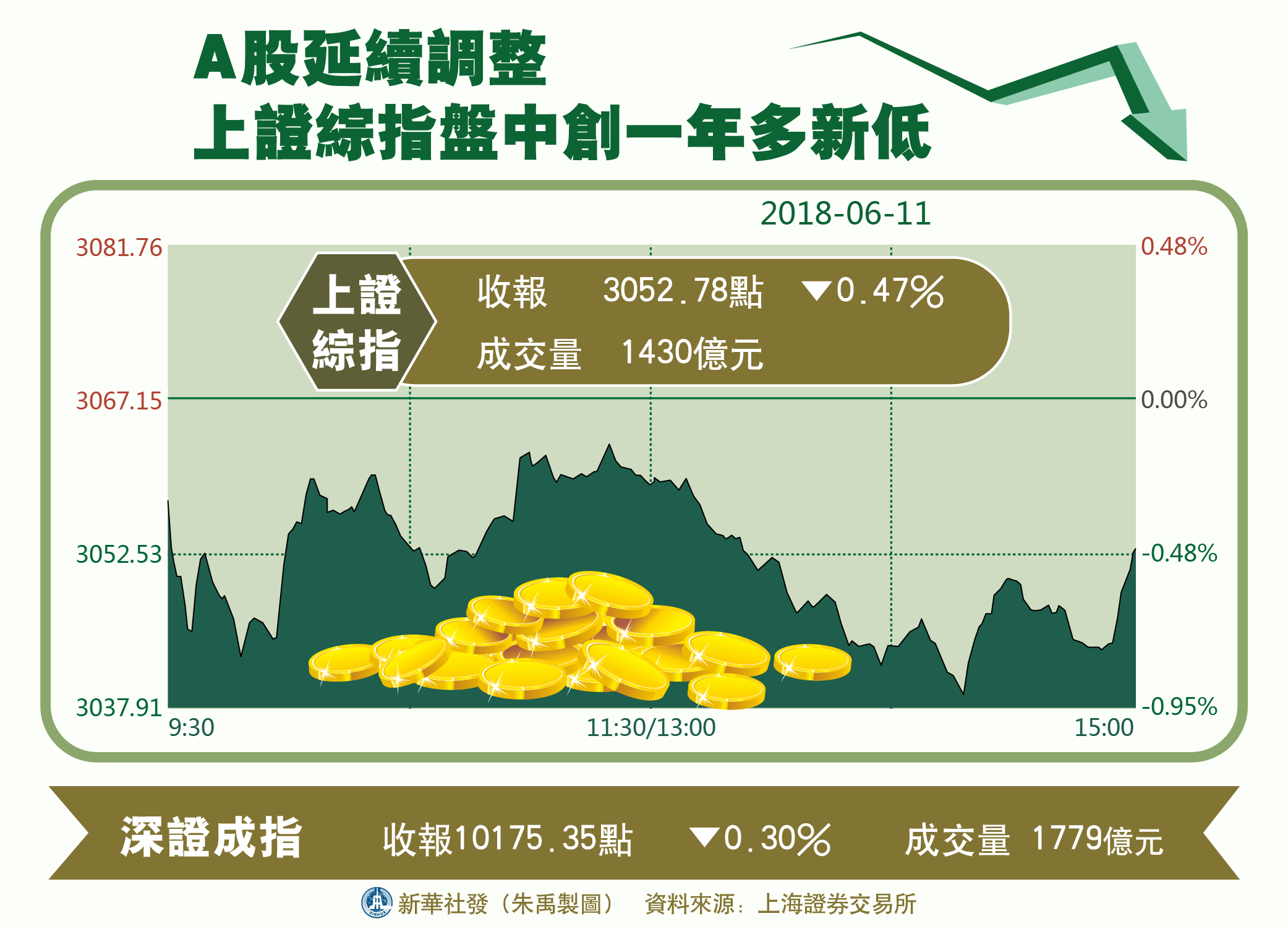 截至當天收盤,上證綜指報3052點,跌幅0.47%,成交1430億元人民幣;深證成指報10175點,跌幅0.3%,成交1778億元;中小板指報6996點,跌0.54%;創業板指報1688點,跌幅1.34%。