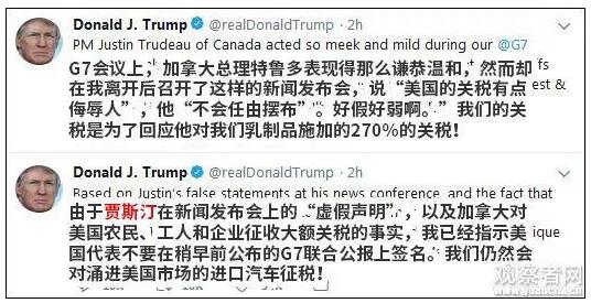 特总统的推特上写得倒是冠冕堂皇:“特鲁多在G7峰会上表现得如此温和,却在我离开后开新闻发布会称’美国的关税是一种侮辱’,并称’(加拿大)不会被摆布’,(他)非常地不诚实和软弱。”