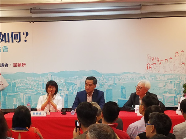 梁振英(中)出席屈穎妍(左)新书发布会。
