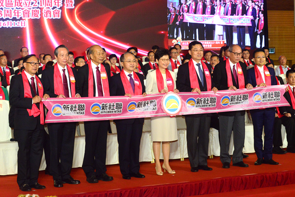 新社聯昨舉行慶回歸21周年及33周年會慶酒會,林鄭月娥(左五)及王志民(左四)等嘉賓出席。記者馮俊文攝