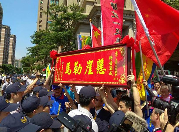 台統促黨欲送「懸崖勒馬」匾額,遭警方阻擋。