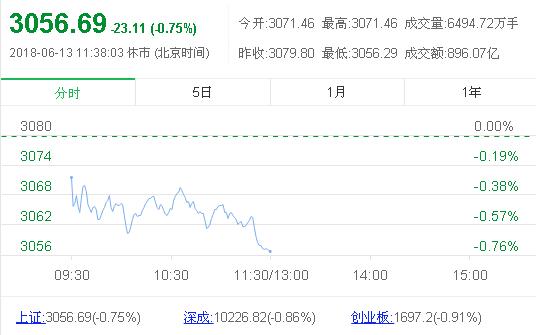 6月13日消息,沪深两市早盘低开,沪深创三大股指持续弱势震荡,均未出现翻红表现,钢铁、海南芯片等板块轮流发力均未带动大盘走势,热点板块均出现冲高回落走势,临近上午收盘,三股指跌幅进一步扩大,截止上午收盘,沪指报3056.69,跌0.75%,创指报1697.20,跌0.91%。