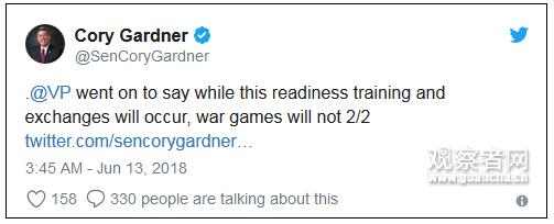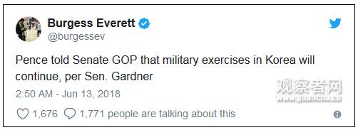 Politico记者:“加德纳说,彭斯告诉共和党参议员,韩国的军演会继续。”