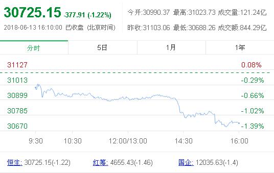 恒指今早低开0.36%,报30990点;大市早盘开盘后震荡下行,午后跌幅加深,盘中最低见30688点。截至收盘,恒指跌1.22%,报30725点;国企指数跌1.4%,报12035点;红筹指数跌1.46%,报4655点;大市全天成交844亿港元。