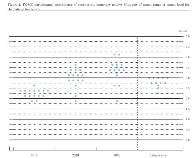 中值预测显示,2018年底联邦基金利率料为2.375%(3月份预计为2.125%)。2019年底联邦基金利率料为3.125%(前次料为2.875%)。2020年底联邦基金利率料为3.375%(前次料为3.375%)更长周期的联邦基金利率料为2.875%(前次料为2.875%)。