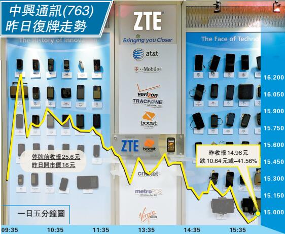 中興被指違反美國對伊朗和朝鮮的貿易制裁,卻未對該負責的職員採取相關行動,遭美國發出禁令,公司因此而進入「休克」狀態。公司低調恢復上市,H股裂口低開近38%見16元,其後反覆偏軟,全日暴瀉41.56%,報14.96元,創下去年5月以來股價新低,市值減少80億港元。中興A股開市即一字跌停直至收市,報28.18元人民幣,A股流通市值蒸發107億元人民幣。折合港元計算,中興A及H市值一日內合共蒸發約212億元。