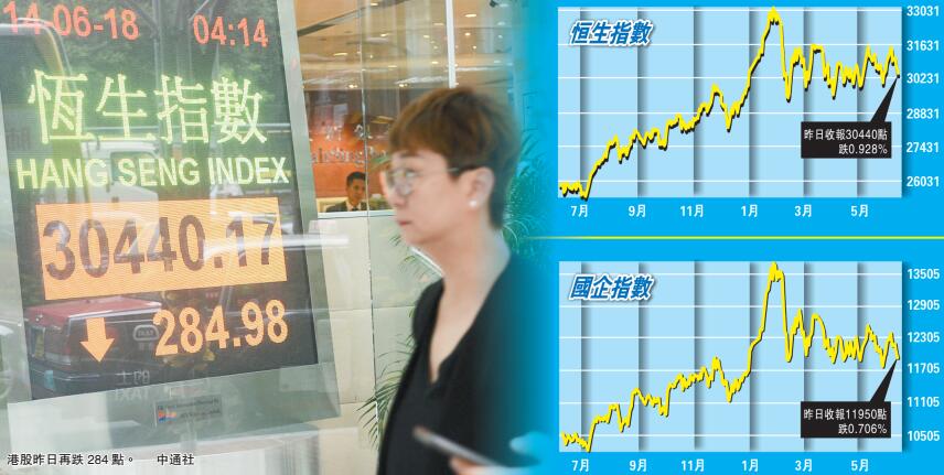 美國聯儲局一如市場預期加息0.25厘,惟局方的利率指引令市場對美國今年將加息四次的預期升溫,聯儲局釋放利率前景偏鷹信號,令美股及亞太區主要股市應聲下跌。此外,內地發布5月份主要經濟數據皆較市場預期遜色,市場對內地經濟開始面臨下行壓力的憂慮加深,加上市場觀望美國即將發布對價值500億美元內地商品加徵關稅的清單,中美貿易戰憂慮再度瀰漫金融市場。技術走勢方面,恒生指數再失守50天平均線,在短期未有重大利好因素支撐下,預計恒指再面臨下試29900點的壓力。