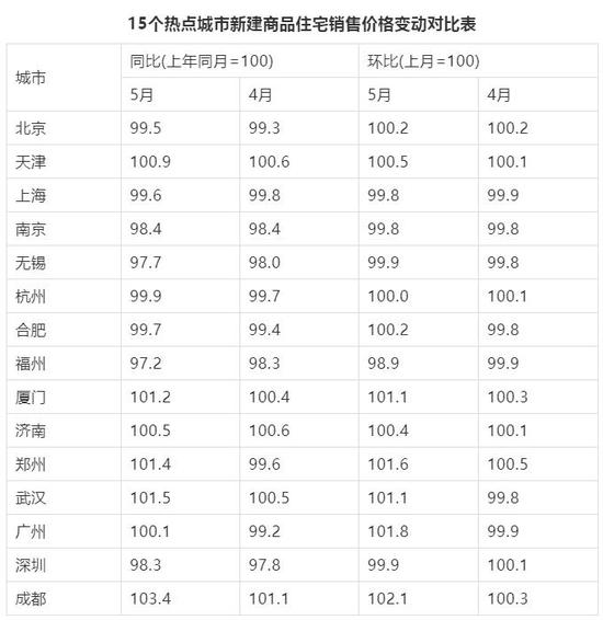 5月份,15个热点城市新建商品住宅销售价格环比下降的城市有5个,比上月减少2个,最大降幅为1.1%;持平的1个;上涨的9个,增加1个,最高涨幅为2.1%。同比下降的城市有8个,比上月减少2个,最大降幅为2.8%;上涨的7个,增加2个,最高涨幅为3.4%。
