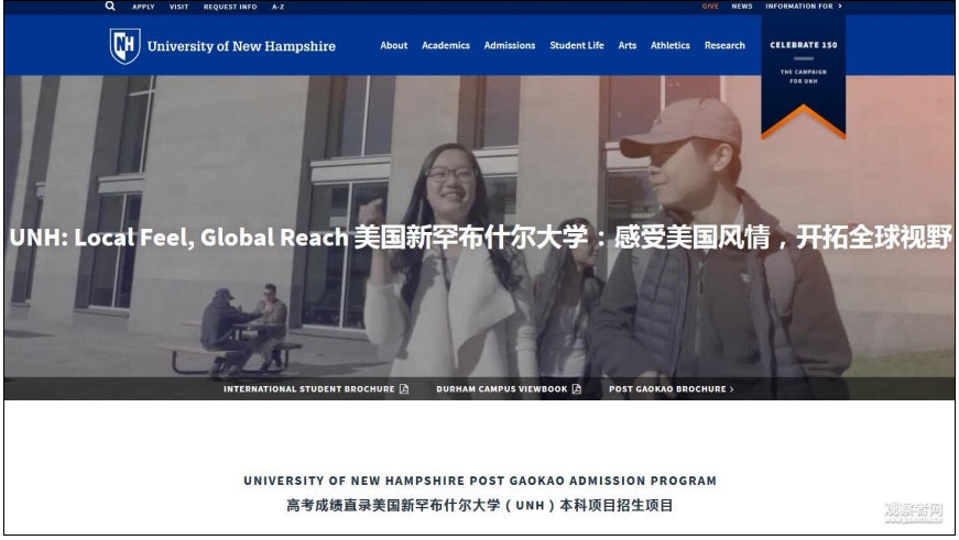 據了解,位於美國東北部的新罕布什爾大學建於1866年,是一所公立學校。新罕布什爾大學已經為「高考錄取項目」建立了中文網頁。根據其中「高考成績直錄本科項目招生計劃」的介紹,該項目適用於擁有高考成績的中國高中畢業生。申請費用為60美元,學費外加住宿等費用約為45459美元一年。