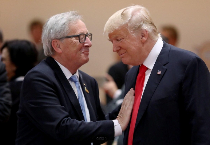 歐盟將對總額達28億歐元的美國商品行使權利,同時通報WTO。圖為特朗普月初在G7峰會中與歐委會主席容克交談。 資料圖片