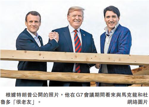 為了釋除與G7各國首腦「鬧僵」的傳言,特朗普15日晚在推特上發布了一些照片,其中一張見到特朗普把右手放在默克爾右手的手背上,默克爾低頭微笑。還有一張是特朗普與馬克龍及東道主加拿大總理杜魯多的合照,三人都對著鏡頭笑,特朗普提起馬克龍的手,緊緊地握。這些照片都與早前德媒公布的那張——默克爾與特朗普「怒目對視」的照片,形成鮮明對比。