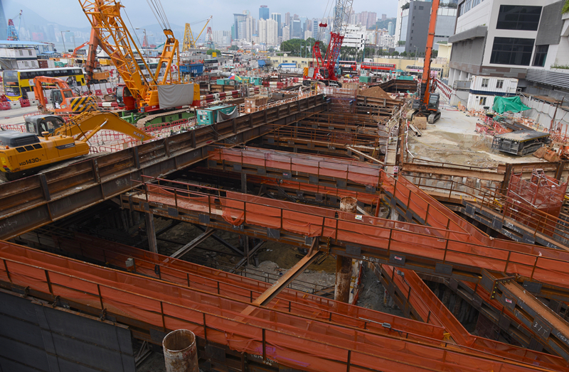 港鐵沙中線會展站被揭挖掘工程中,承建商未有放置足夠的橫向支撐架。中通社
