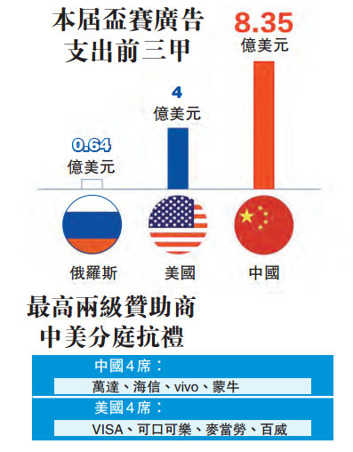 數據顯示,本屆世界盃中國企業由此前兩屆只有1家官方贊助商增加到此次的7家贊助商,同時廣告支出最多達到8.35億美元,是投入4億美元美國的兩倍,更遠高於東道主俄羅斯的6400萬美元。