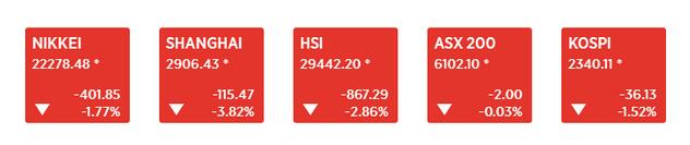 亚太股市:亚太股市全线收跌,中国股市跌势尤为惨烈,上证综指创出两年最低水平,香港恒生指数回吐今年所有涨幅。日本股市大跌近2%。